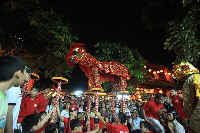 Tiết mục múa lân gây không khí sôi động nhất. Phố cổ Hội An tưng bừng đến hơn 23h đêm. |