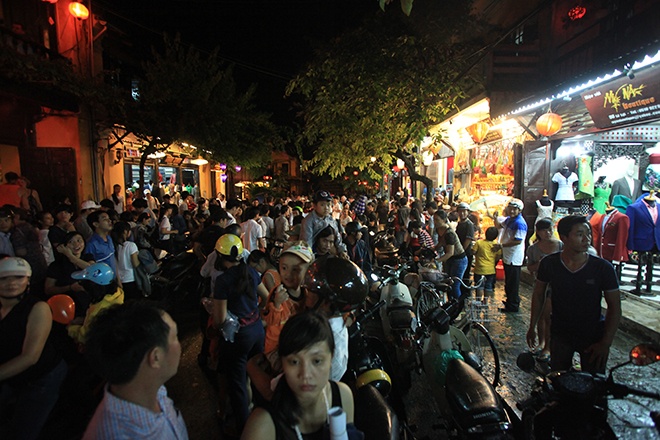 | Phố Lê Lợi, Trần Hưng Đạo, Nguyễn Thái Học…trung tâm của đô thị cổ Hội An (Quảng Nam), cảnh ùn tắc sớm diễn ra từ chiều tối. |