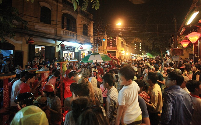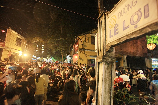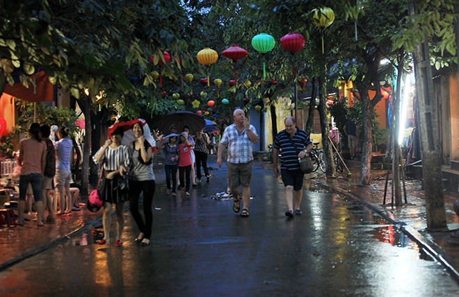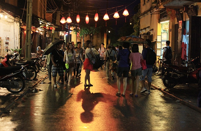 | Nhưng người dân và khách du lịch vẫn đội mưa đi ngắm phố cổ đêm trung thu. |