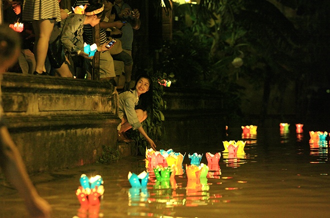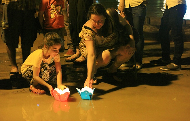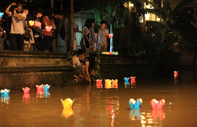 | Bên sông Hoài, giới trẻ gửi niềm vui và điều ước vào những đài hoa và thả trôi theo dòng nước ngập. |