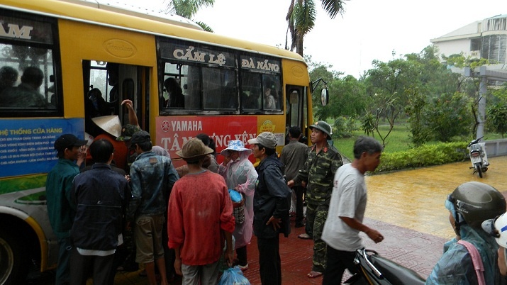 | Người dân ôm mền, chiếu, chăn gối đồ đạc ra xe buýt để trở về nhà, trên mặt ai cũng nở nụ cười xua tan lo lắng từ ngày hôm qua khi dự báo siêu bão Haiyan sẽ đổ bộ vào Quảng Nam. |