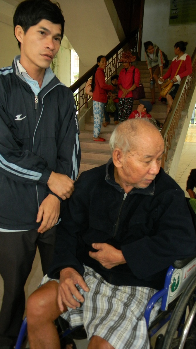 | Một cụ già ngồi xe lăn chuẩn bị được đưa lên xe buýt. |