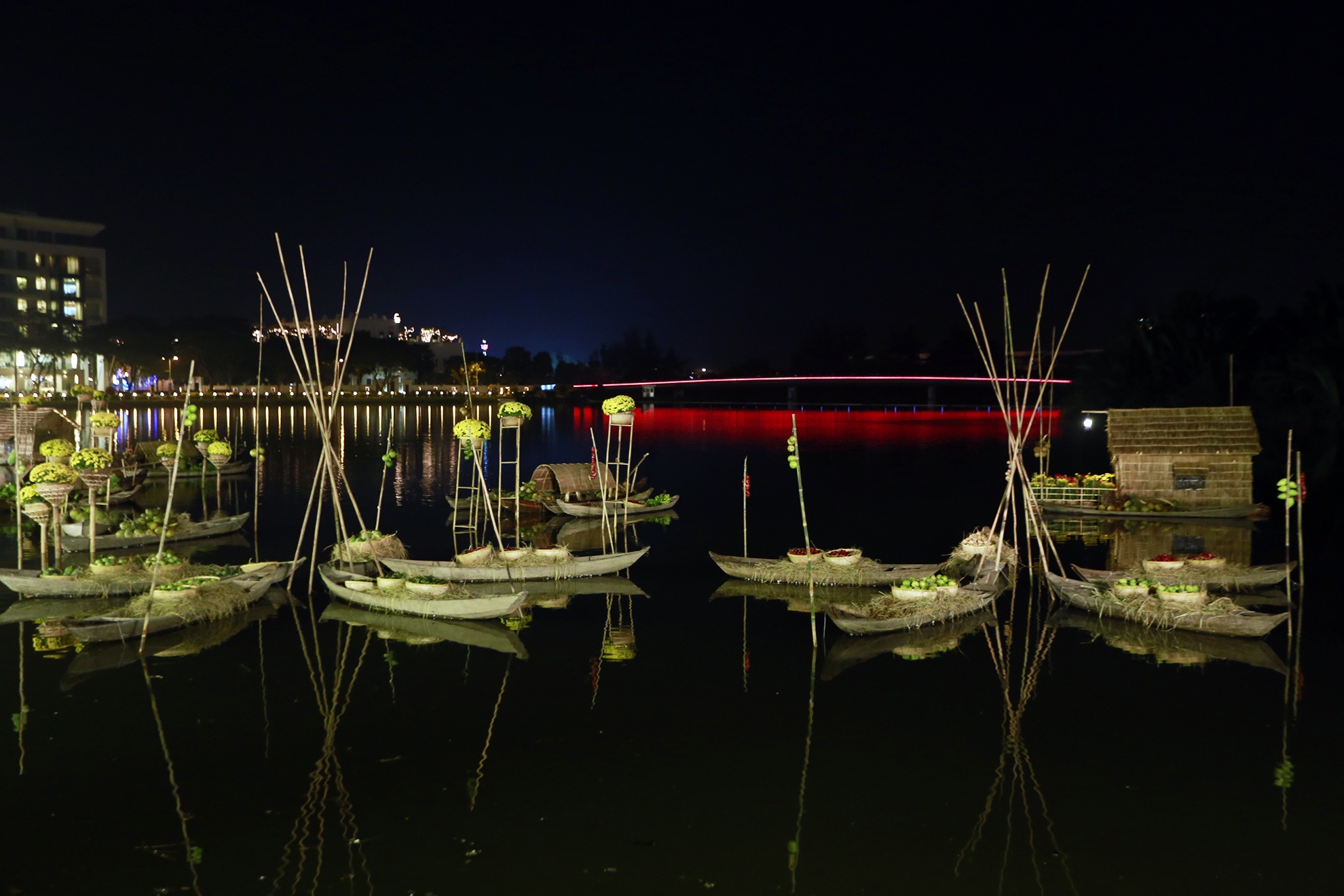 | Bến hoa giữa hồ Bán Nguyệt lung linh dưới ánh sáng nhân tạo. |