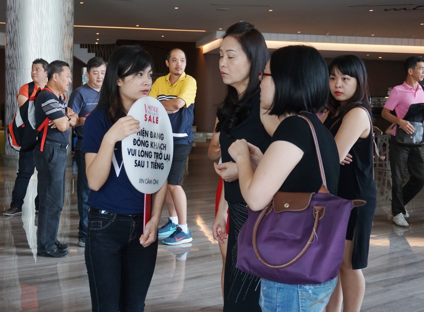 | Mở cửa lúc 9h, nhưng từ sáng sớm, khách hàng đã tập trung tại sảnh tầng 1 khách sạn Pullman để.. xí chỗ. Chưa đầy 30 phút sau giờ mở cửa, ban tổ chức đã trưng biển hẹn khách quay lại sau 1 tiếng, vì gian bán hàng quá tải. |