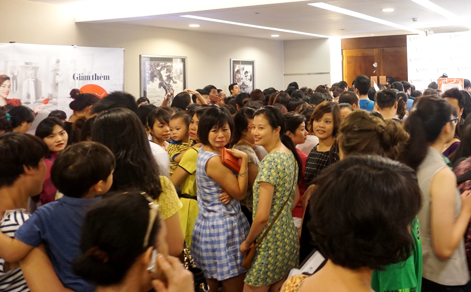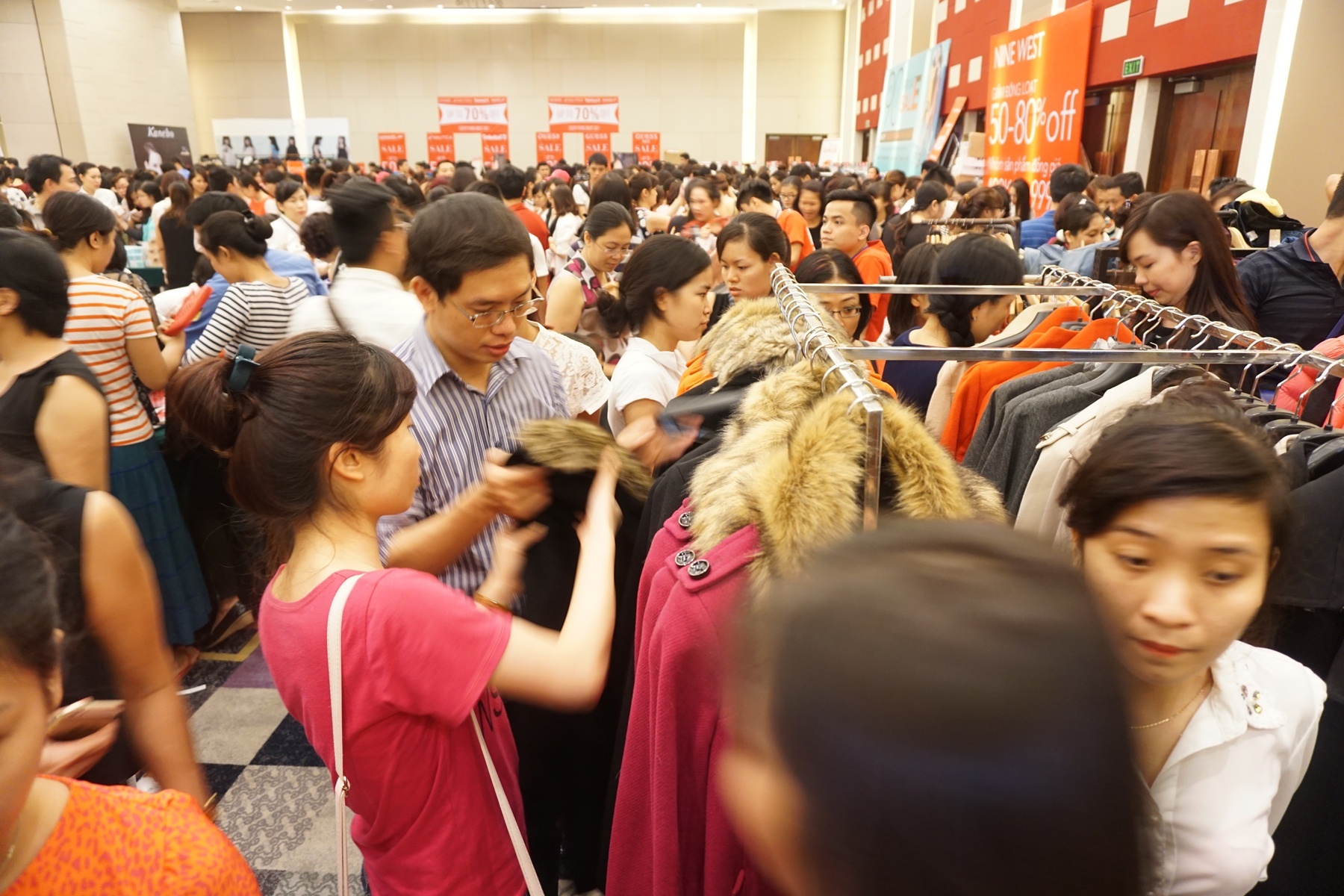 | Tại sảnh tầng 2, hàng nghìn người tranh nhau chỗ đứng tốt để có thể tiếp cận với cửa vào gian bán hàng luôn đóng vì quá tải. Khách tới mua hàng hiệu giảm giá đủ mọi thành phần, lứa tuổi. Nhiều bố mẹ không lường trước sự việc đã mang cả con nhỏ chen chúc trong không gian ngột ngạt, nhiều bà bầu cũng không ngại chen lấn xếp hàng. |