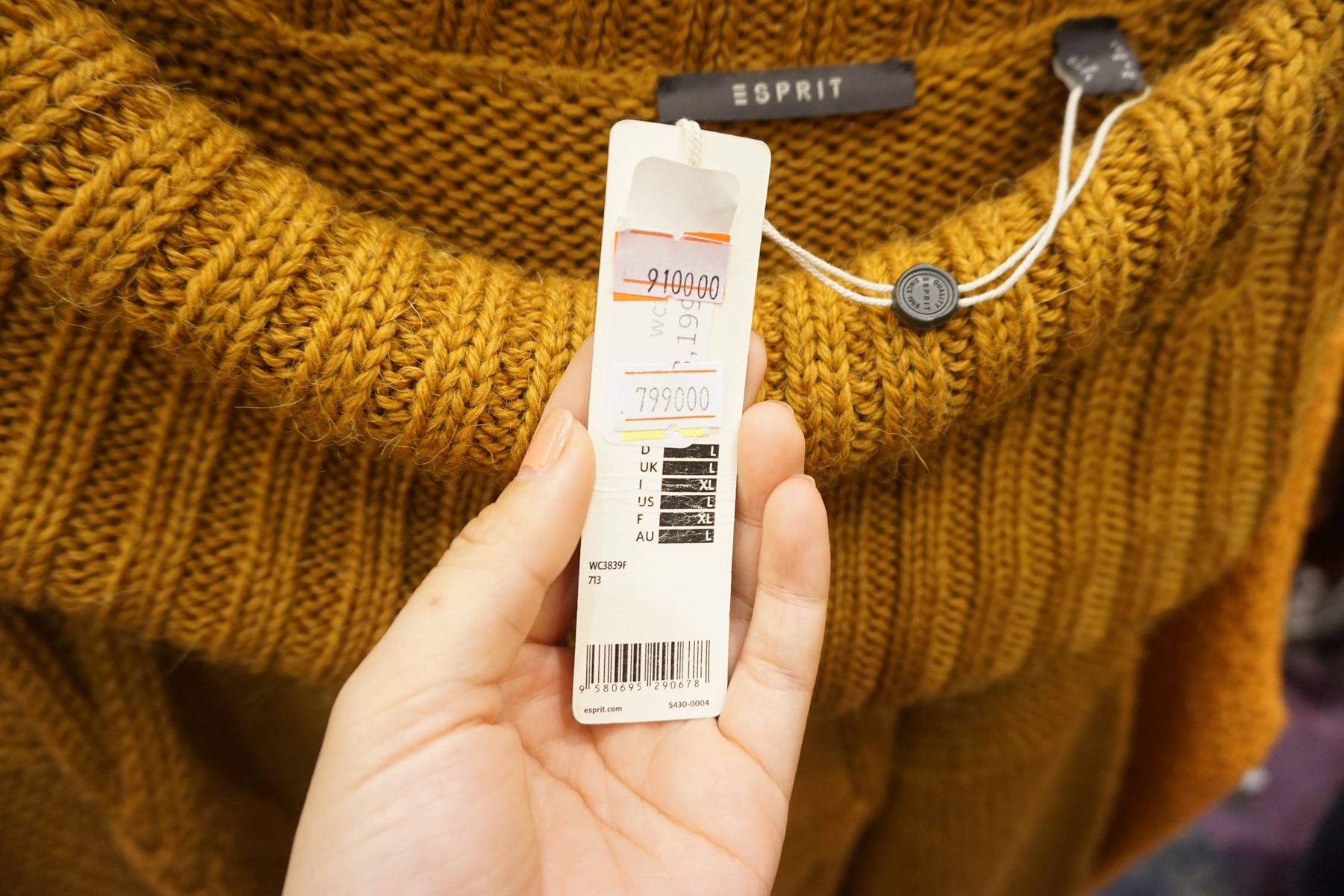 | Giá giảm 30-50%, nhưng số tiền khách phải trả cũng không hề rẻ, từ 1 đến vài chục triệu đồng/sản phẩm. Trong ảnh là một mẫu áo len thương hiệu Esprit bán giảm giá khá đắt khách. Theo nhân viên đứng quầy, sau khi bán khoảng 30 phút, cả dây áo chỉ còn duy nhất 1 chiếc cỡ lớn. |