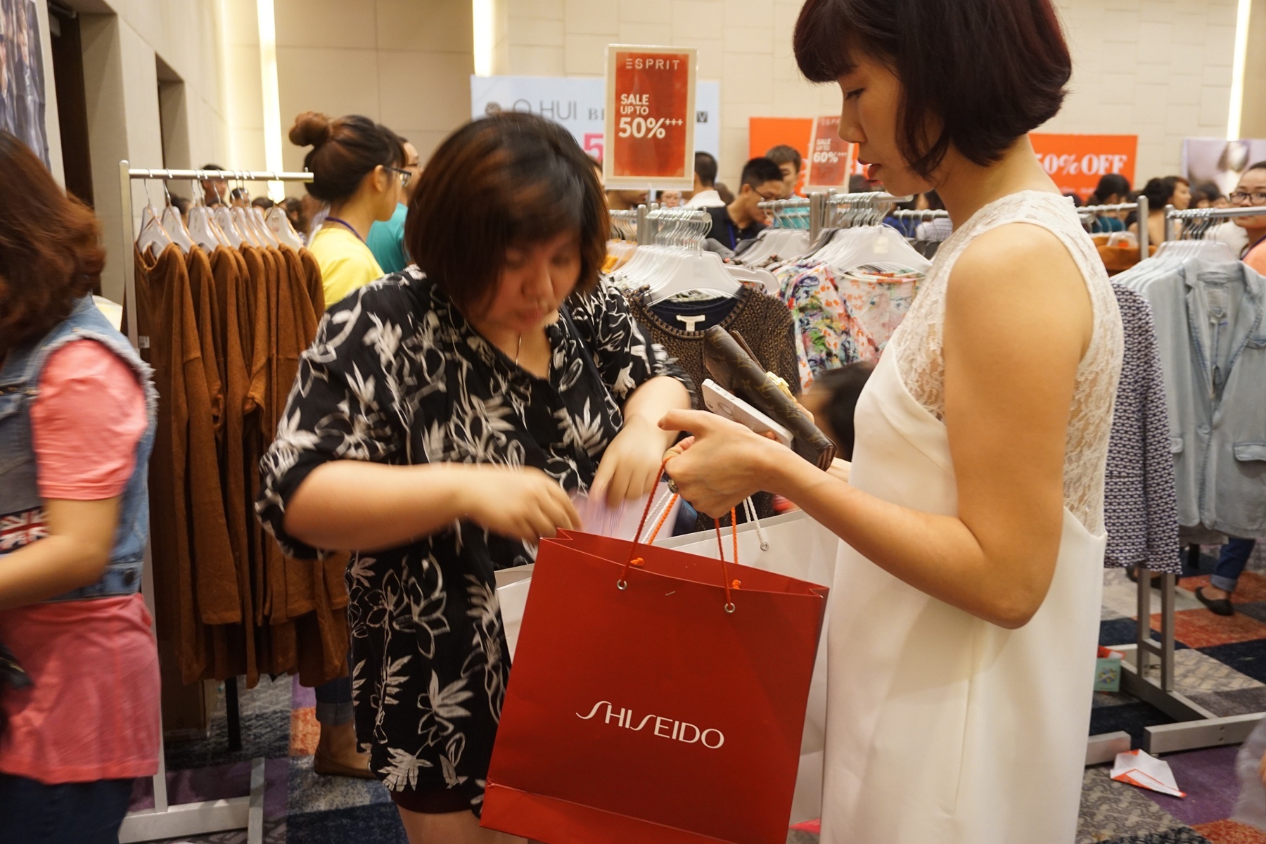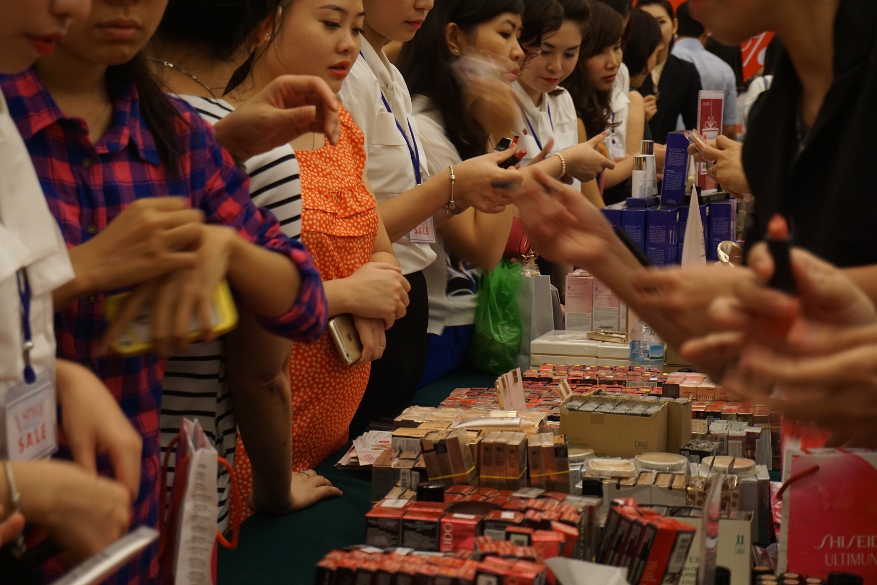 | Quầy mỹ phẩm các thương hiệu Shideido, Kanebo của Nhật là 2 trong số những quầy hàng đông khách nhất. Được giảm giá 30-50% cho mỗi sản phẩm, nhiều mẹ bầu cũng không ngại chen lấn ngột ngạt để thử sản phẩm và chọn mua. |