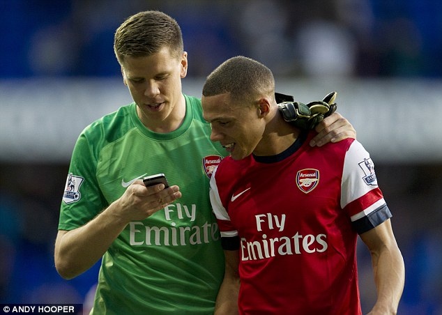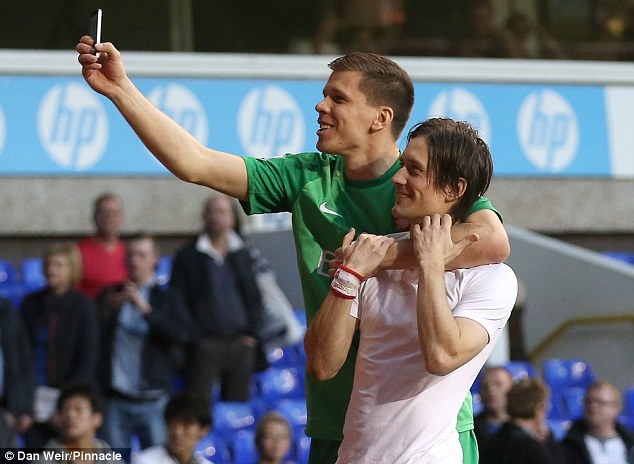 Thủ môn thành người Ba Lan xì-tin chụp ảnh cùng đàn anh Rosicky. |
