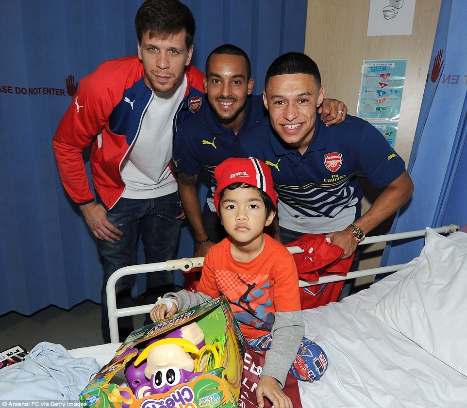 | Arteta, Chambers, Walcott, Szczesny và Oxlade-Chamberlain giao lưu với các bệnh nhân tại khoa. |