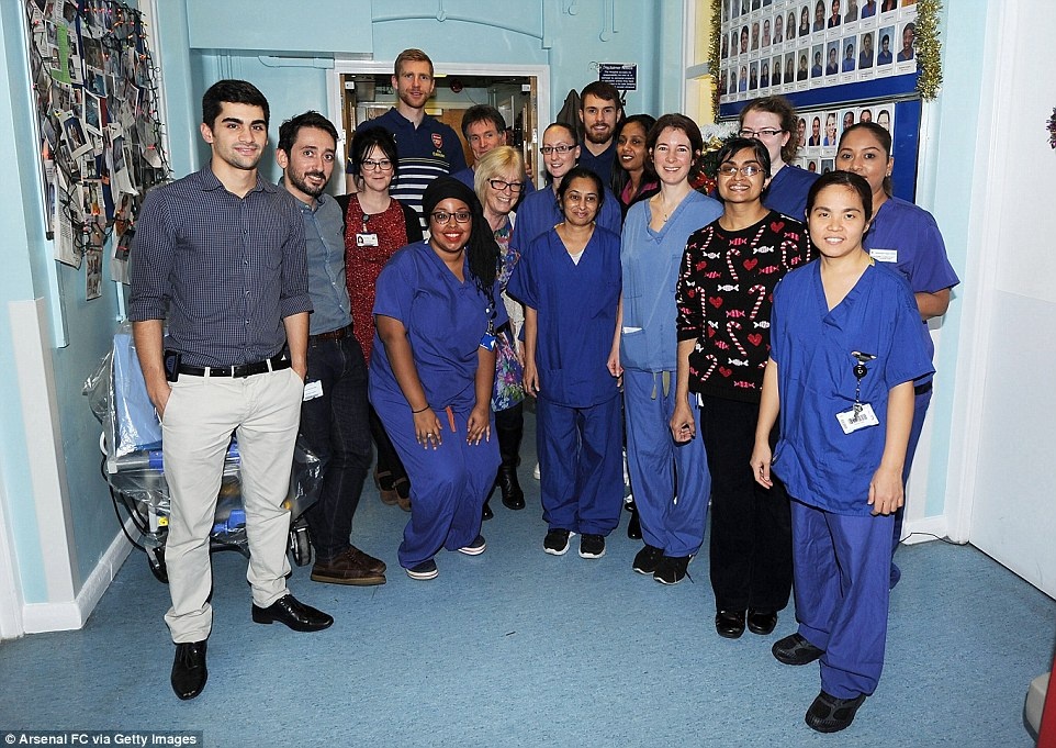 | Mertesacker và Ramsey chụp ảnh cùng nhân viên và bệnh nhân khoa trẻ em. |