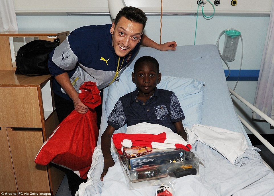 | Tiền vệ Mesut Oezil cũng đang trong quá trình điều trị chấn thương, song anh vẫn dành thời gian để đi thăm các em nhỏ. |