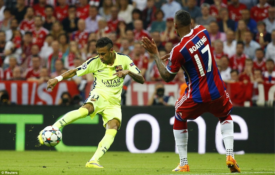 | Bộ ba Messi - Suarez - Neymar xé toang hàng phòng ngự Bayern Munich bằng những pha phối hợp như đá tập ở trận bán kết lượt về. |