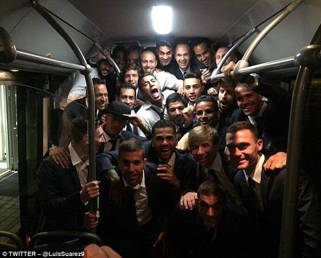 | Các cầu thủ Barca chụp ảnh kỷ niệm trên đường ra sân bay để trở lại Barcelona. Luis Suarez đăng tấm hình lên Twitter cá nhân kèm theo chú thích: "Chúng tôi đã tiến vào chung kết. Thật tự hào".