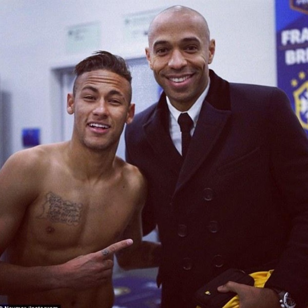 | Sau trận gặp Chile, tiền đạo chủ lực của ĐT Brazil chụp ảnh cùng cầu thủ lừng danh một thời Thierry Henry. Anh cho rằng, Henry là chân sút xuất sắc trong lịch sử bóng đá. |