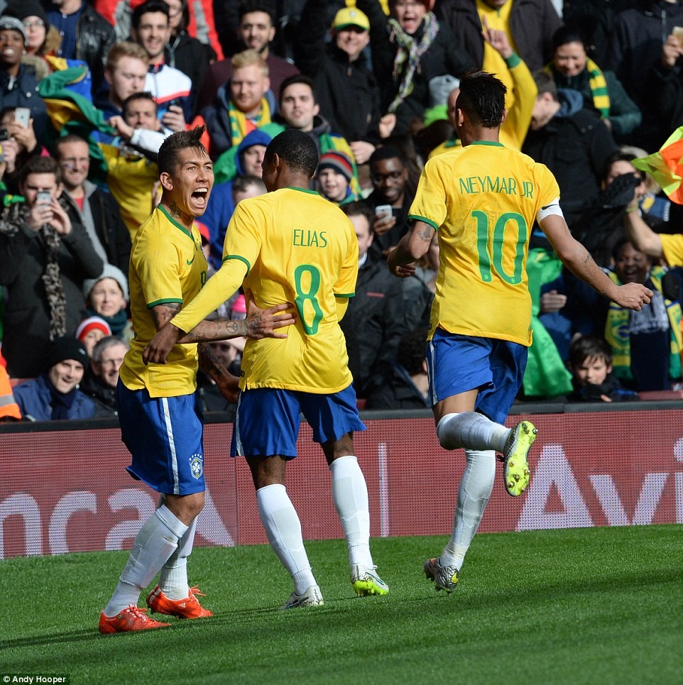 | Gặp Chile trên sân Emirates (London, Anh), Roberto Firmino (trái) ghi bàn duy nhất trận cho ĐT Brazil. Đây là chiến thắng thứ tám liên tiếp của đội tuyển áo vàng-xanh dưới thời HLV Dunga. |