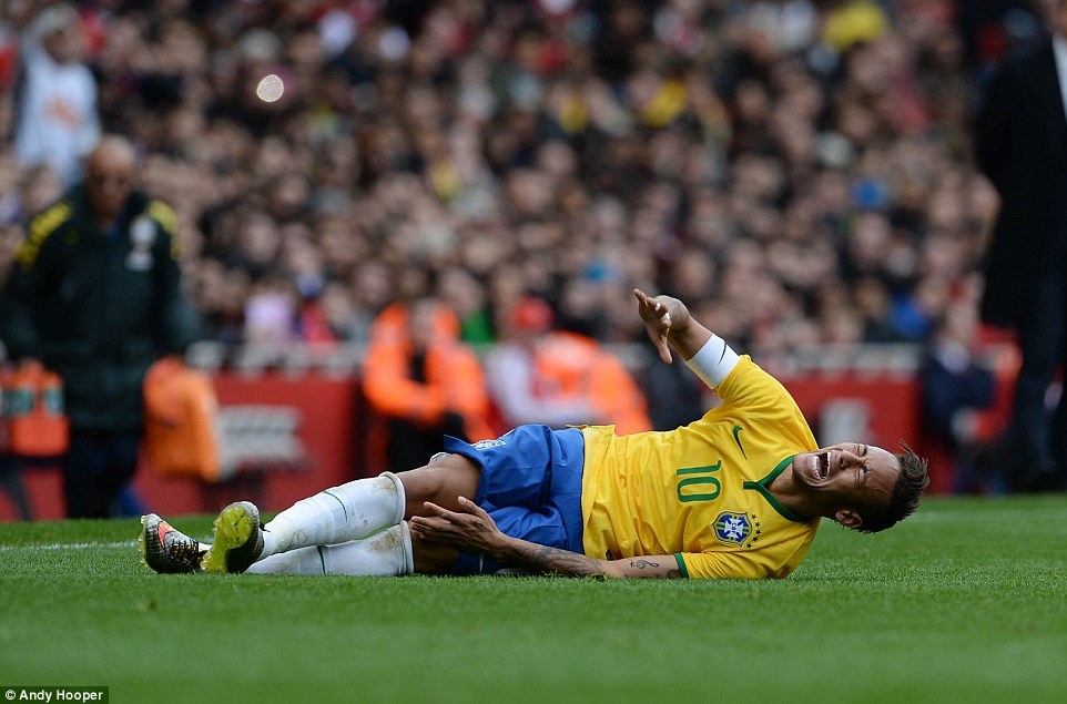 | Neymar tỏ ra khá đau khi bị cầu thủ Chile phạm lỗi. Anh chơi hay khi trở về phục vụ đội tuyển quốc gia với 8 bàn trong 8 trận gần nhất. |