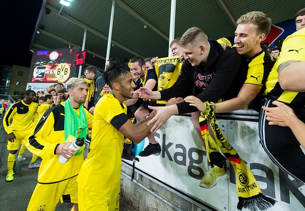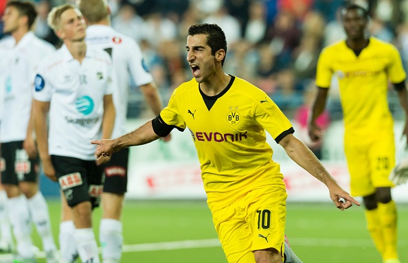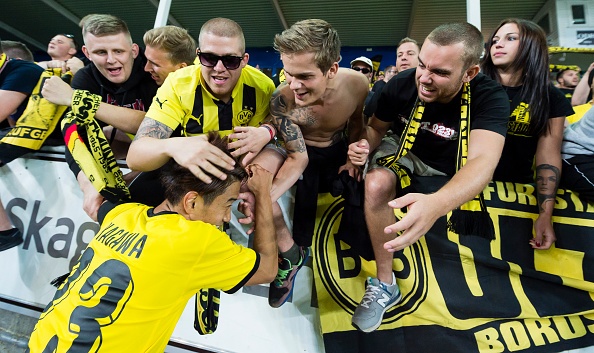 | Tiền đạo Mkhitaryan chia sẻ niềm vui với số ít người hâm mộ Dortmund có mặt trên sân Skagerak Arena. |