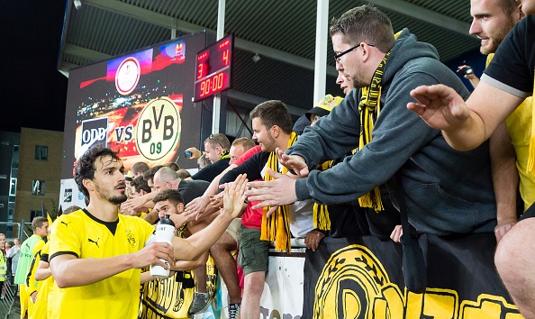 | Thủ quân Mats Hummels cùng đồng đội cảm ơn những cổ động viên sát cánh cùng Dortmund dù thi đấu xa nhà. |