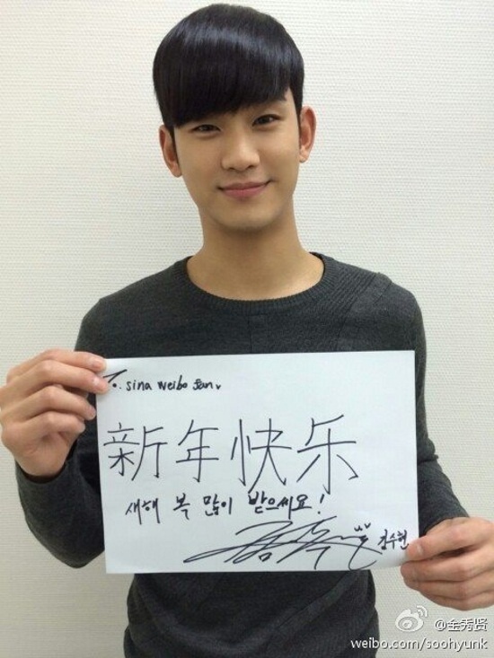 | Kim Soo Hyun đã gửi những lời chúc mừng năm mới tới các fan Trung Quốc với thông điệp do chính tay anh viết: “Năm mới vui vẻ. Năm mới tốt lành”. |