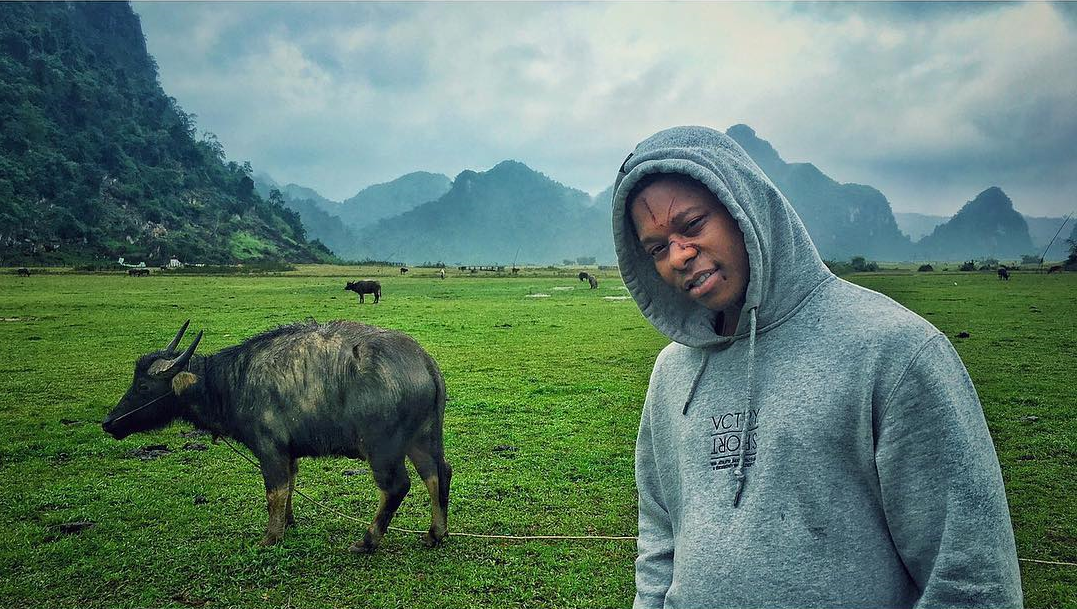 Nam diễn viên Jason Mitchell cũng lưu lại những khoảnh khắc ở làng quê Việt Nam. Trong bức ảnh gần nhất, anh chụp ảnh trên một đồng cỏ xanh mướt, xa xa là những chú trâu.