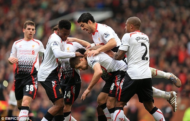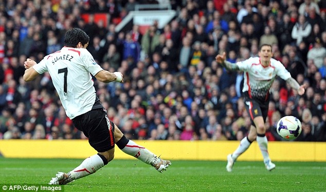| Suarez ấn định tỷ số 3-0 cho Liverpool ngay trên sân Old Trafford. |