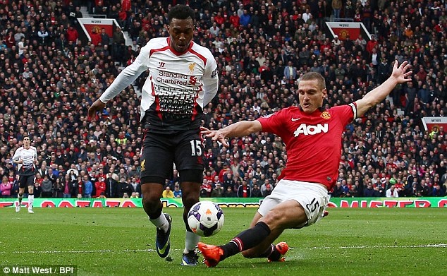 | Vidic truy cản Sturridge đi bóng trong vòng 16m50. |