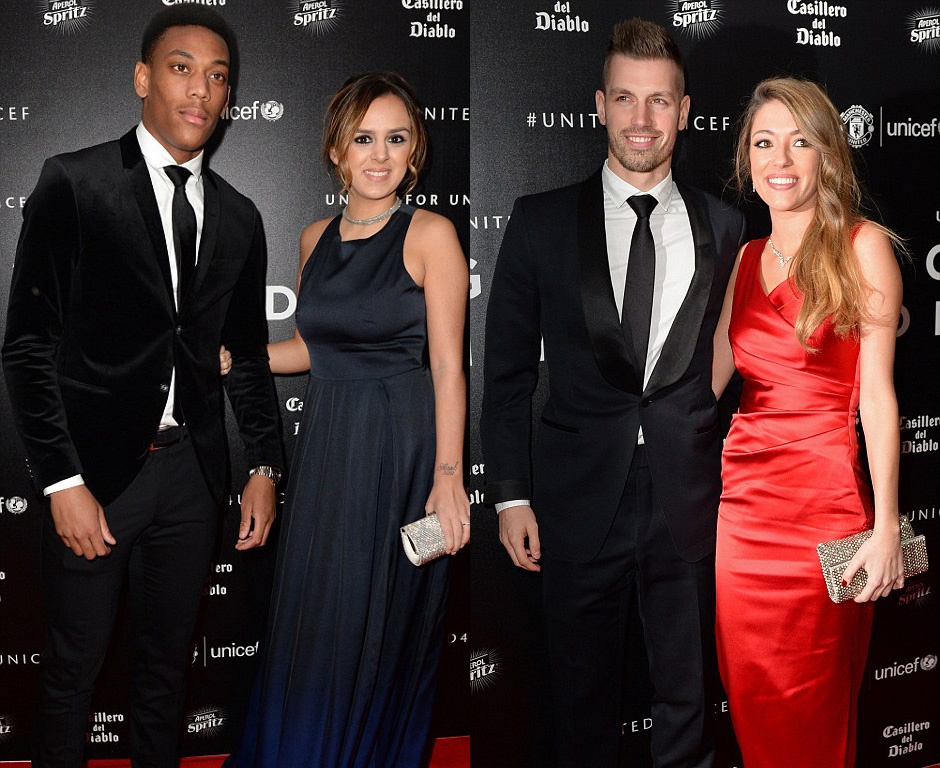 | Tiền đạo 19 tuổi người Pháp Anthony Martial (trái) đến cùng vợ Samantha, còn tiền vệ đồng hương Morgan Schneiderlin đi cùng bạn gái Camille Sold. |