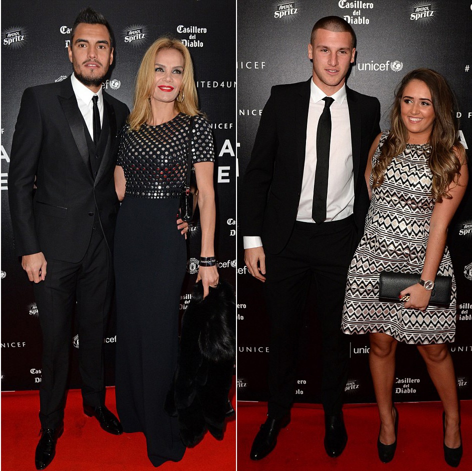 | Thủ môn Sergio Romero (trái) sánh đôi bên bà xã Eliana Guercio. Thủ thành trẻ Sam Johnstone cũng đưa bạn gái đến dự tiệc. |