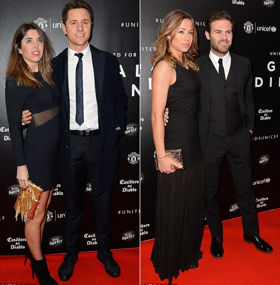 | Tiền vệ người Tây Ban Nha, Ander Herrera dự "Gala Dinner" cùng bóng hồng Isabel Collado, trong khi đồng hương Juan Mata đến cùng người đẹp Evelina Kamph. |