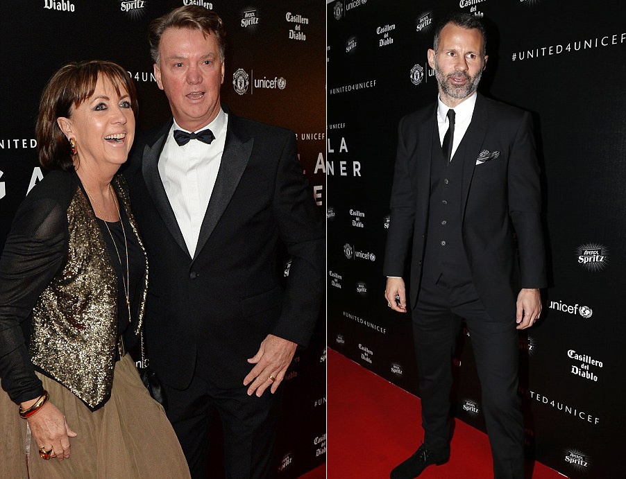 | Huấn luyện viên Van Gaal đi cùng bà xã, trong khi trợ lý Ryan Giggs đến một mình. |