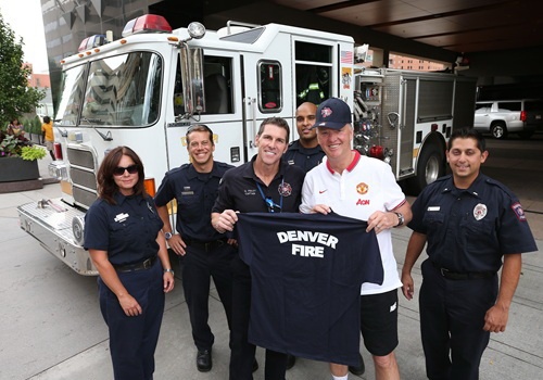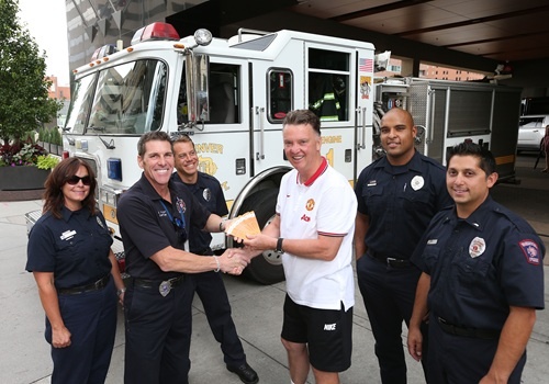 | HLV Van Gaal giao lưu cùng các nhân viên của sở cứu hỏa Denver. |