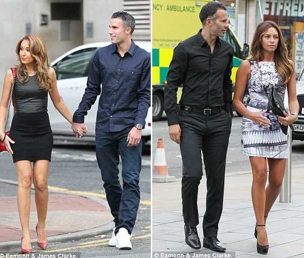 Tiền đạo Robin Van Persie và vợ Bouchra (trái), Ryan Giggs và bà xã Stacey Giggs (phải). Ở trận gặp Swansea, hai cầu thủ này đã thi đấu khá tốt. Trong đó, chân sút Van Persie có hai pha ghi bàn đẳng cấp vào lưới đối phương.