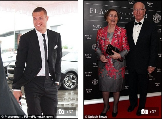 | Trung vệ Nemanja Vidic và vợ chồng Sir Bobby Charlton. |