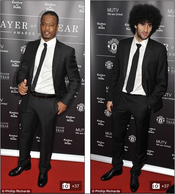 | Hậu vệ lão tướng Patrice Evra cùng đồng đội Marouane Fellaini. |