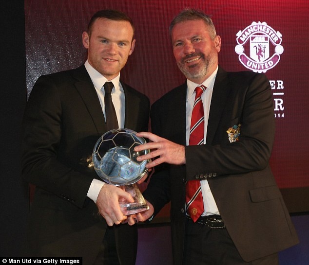 | Wayne Rooney nhận danh hiệu Bàn thắng của mùa (lốp bóng từ giữa sân vào lưới West Ham hồi tháng 3) từ cựu danh thủ M.U, Brian McClair. |