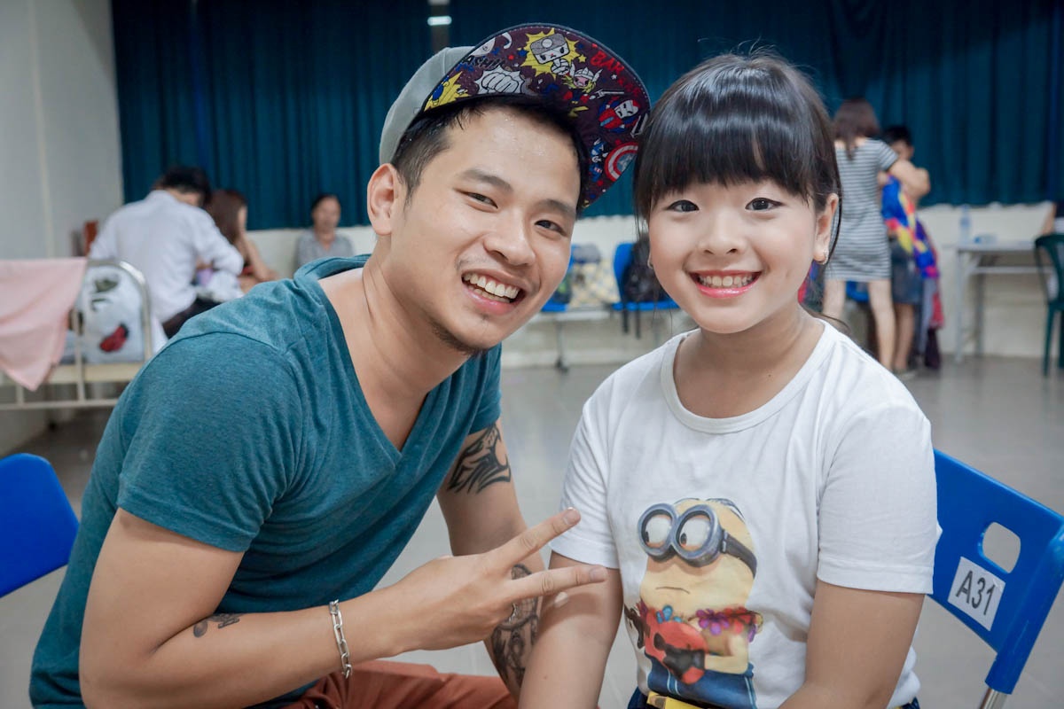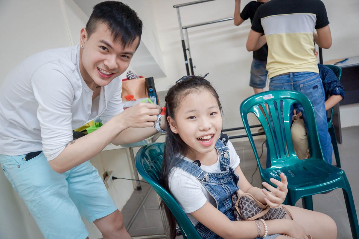 | Cùng góp mặt trong chương trình ca nhạc Cười lên Việt Nam, các bé đã có cơ hội gặp lại nhau và được chuyên gia trang điểm Hoàn Khang cùng ê-kíp của mình chăm sóc trước khi lên hình tối 14/10. Trong ảnh là con gái của nghệ sĩ Chiều Xuân - bé Hồng Khanh. |