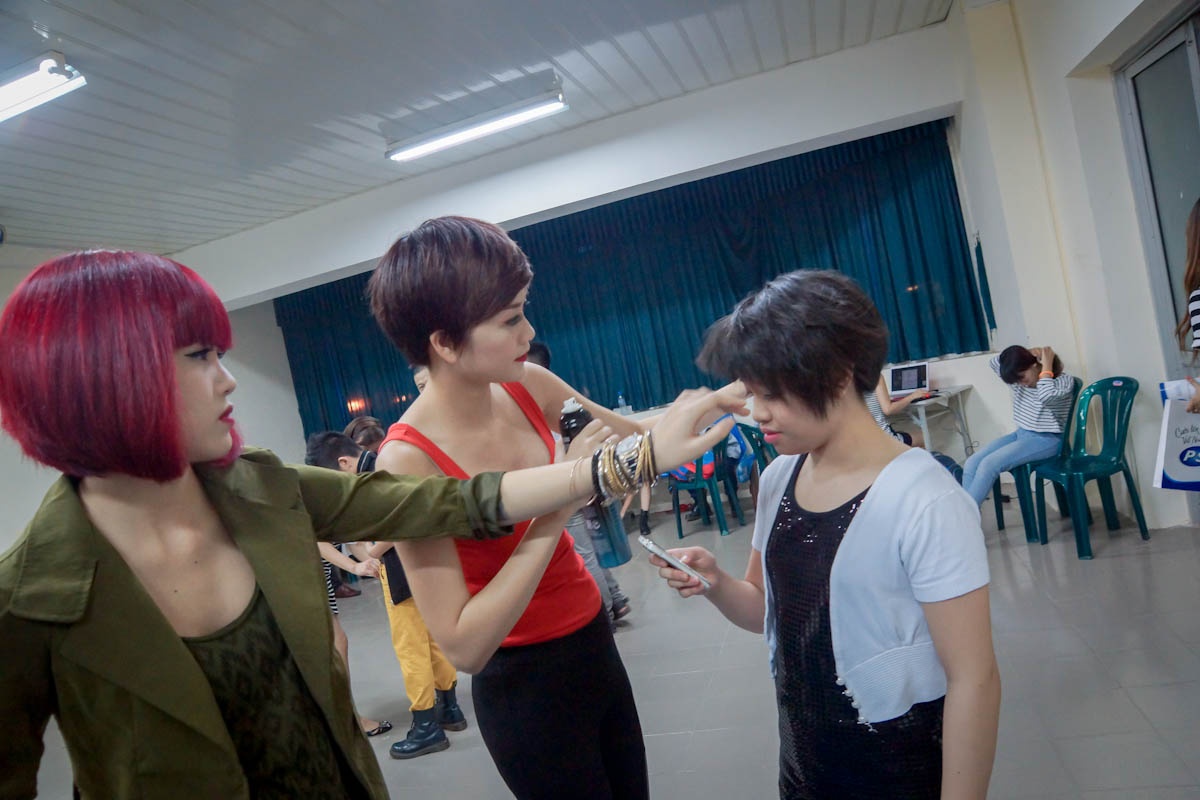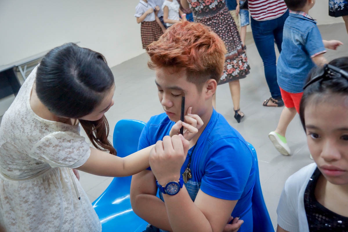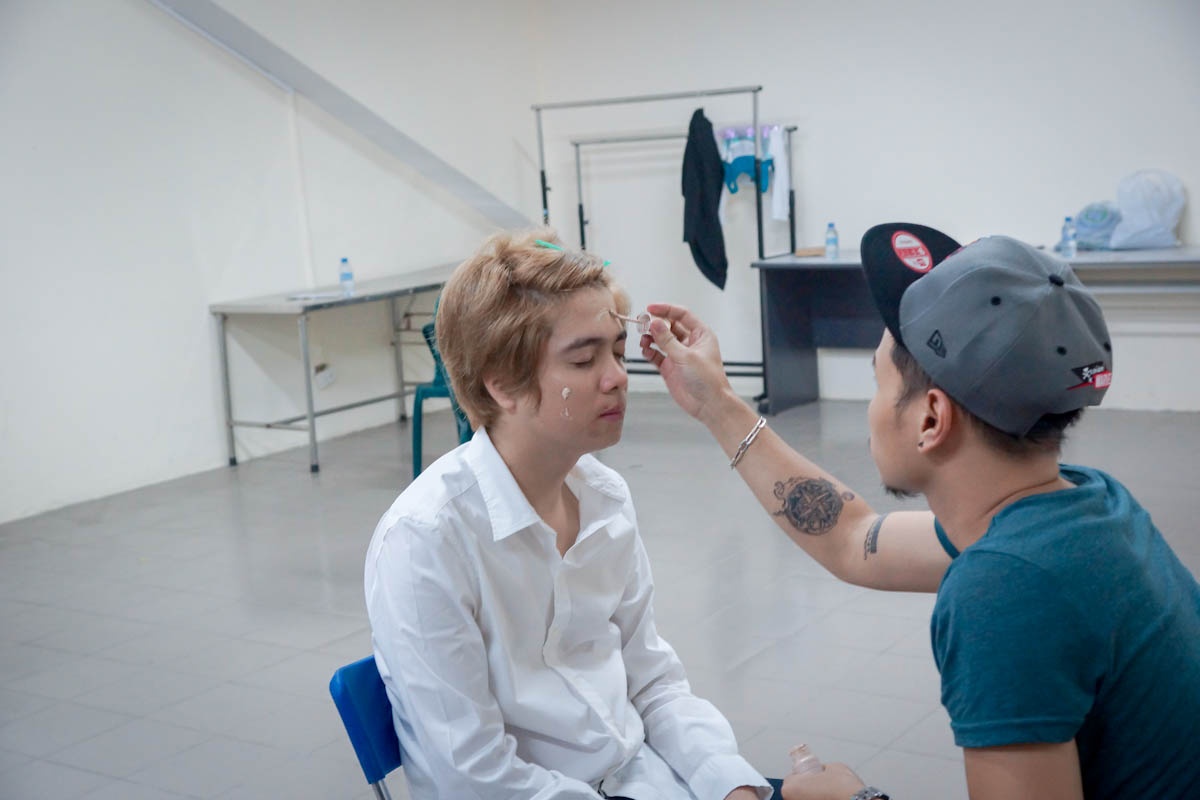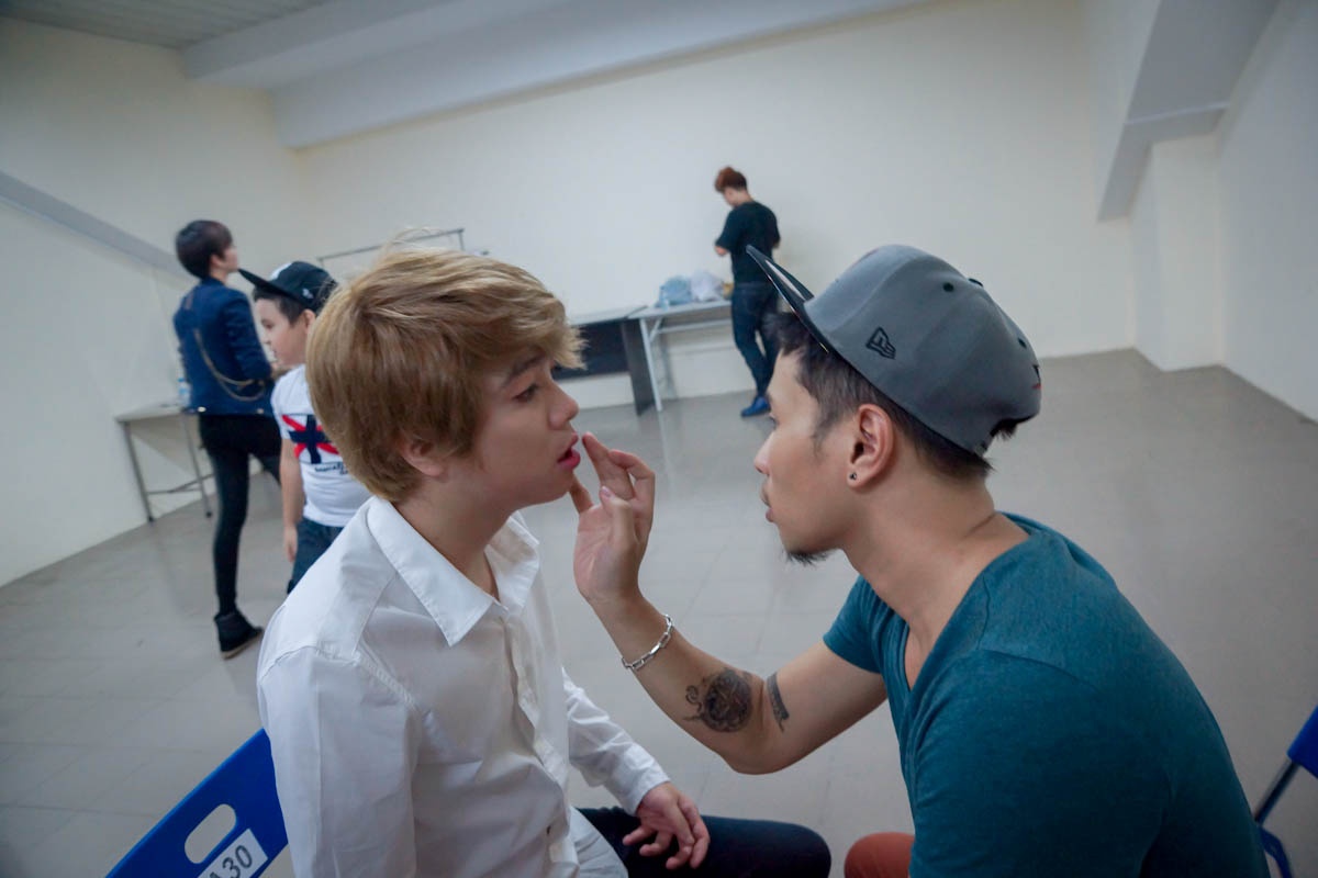 | Phúc Nguyên vừa được trang điểm vừa tranh thủ nói chuyện với các bạn. |