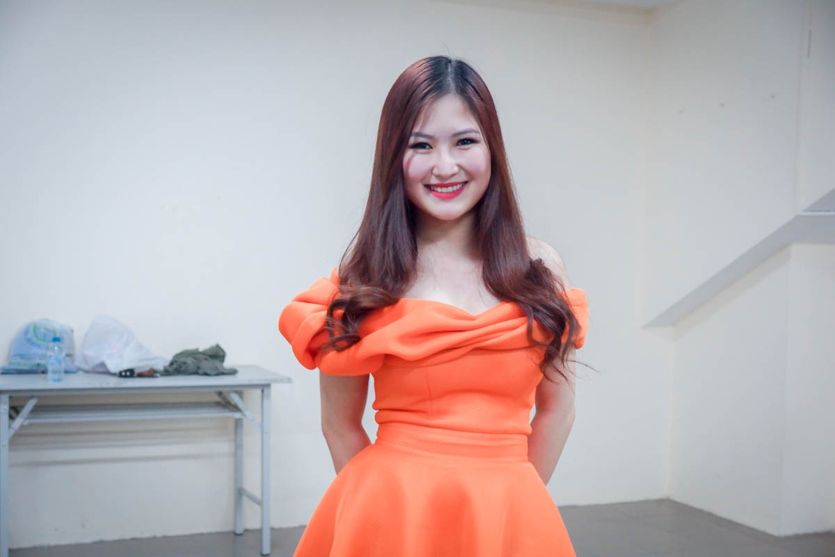 | Hương Tràm với bộ đầm cam nổi bật. |