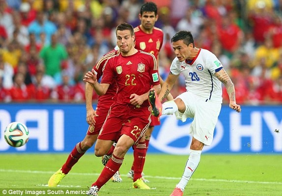 | Eduardo Vargas ghi bàn đưa Chile vượt lên dẫn trước ở phút 20. Nỗ lực của thủ môn Casillas và Ramos không thể giúp Tây Ban Nha tránh được bàn thua. |