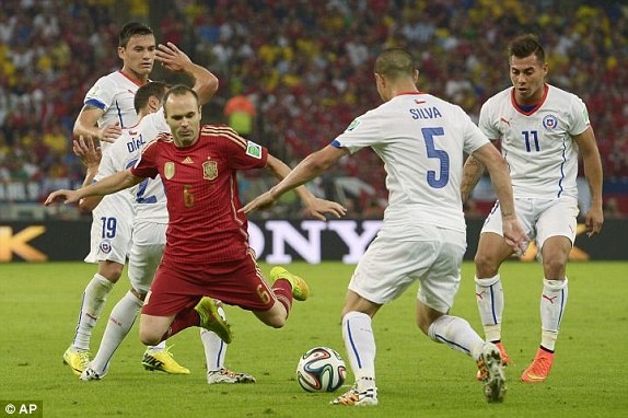 | Nỗ lực bất thành của Iniesta trong vòng vây của các cầu thủ Chile. |