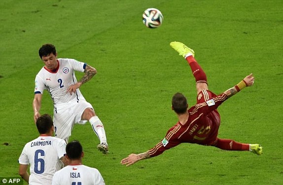 | Sergio Ramos cố gắng ghi bàn thắng danh dự cho tuyển Tây Ban Nha nhưng thất bại. Anh thực hiện cú volley đưa bóng đi chệch khung thành ĐT Chile. |
