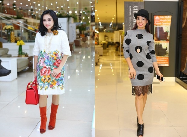 | Ca sĩ Thanh Lam phối đồ trẻ trung. Cựu mẫu Thúy Hằng khoe dáng với họa tiết chấm bi. |