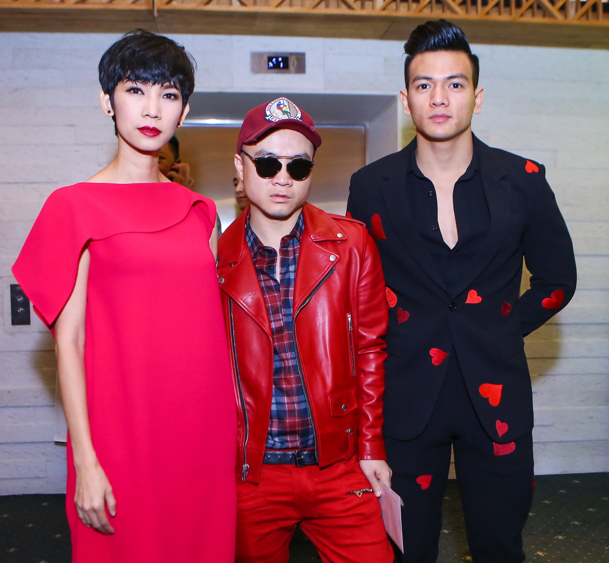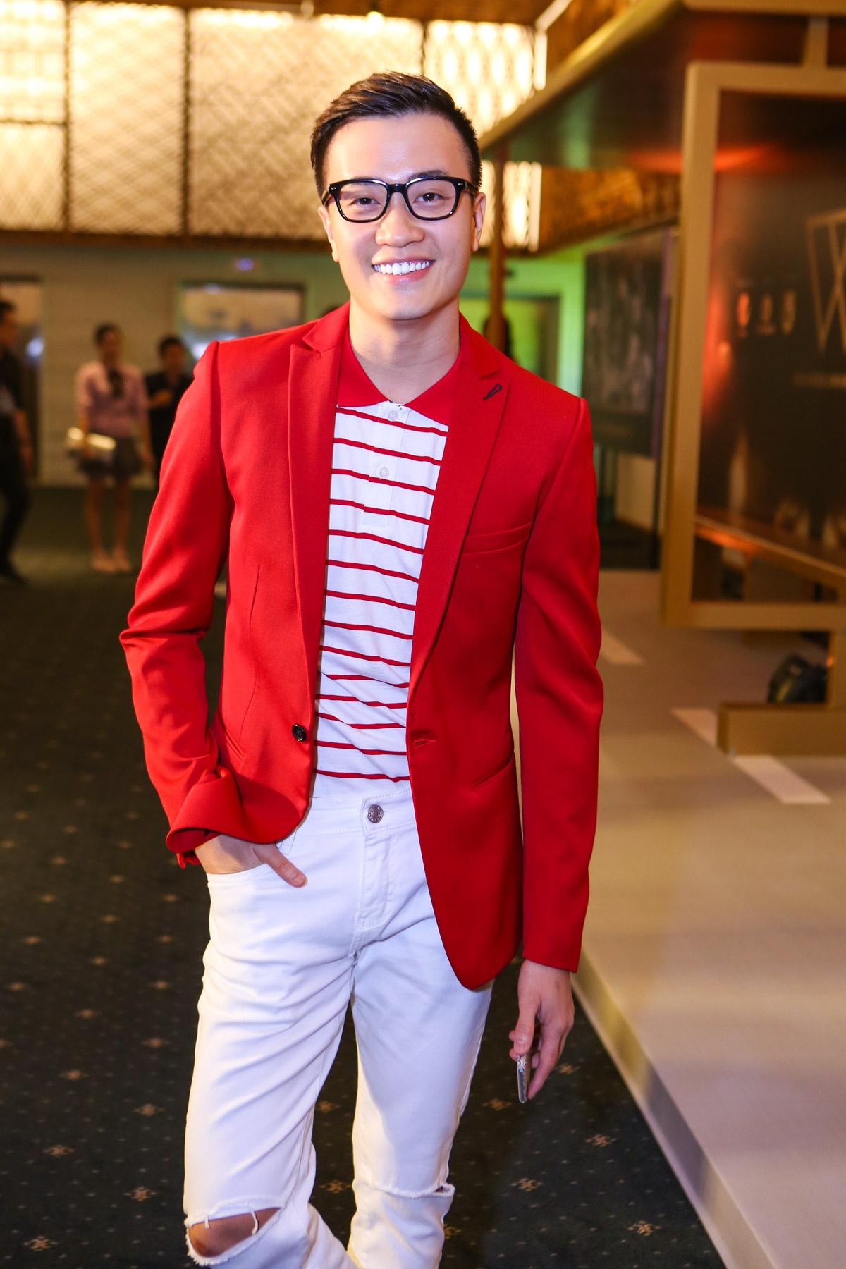 | Lương Mạnh Hải trẻ trung dự tiệc với vest đỏ. |