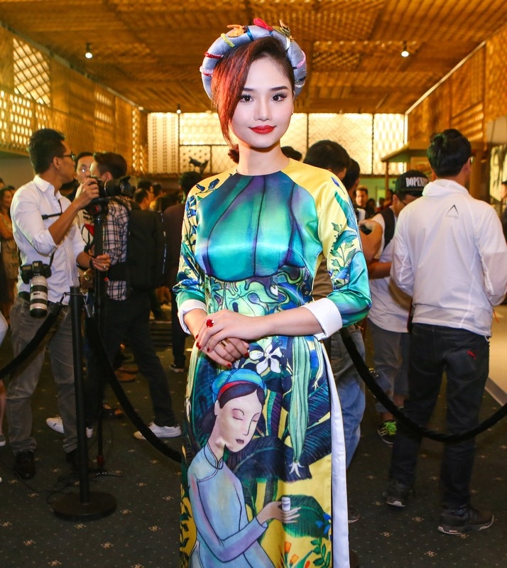 | Miu Lê duyên dáng khi diện áo dài truyền thống và vấn tóc. 2015 là năm thành công của Miu Lê vì diễn xuất trong Em là bà nội của anh được đánh giá cao. |