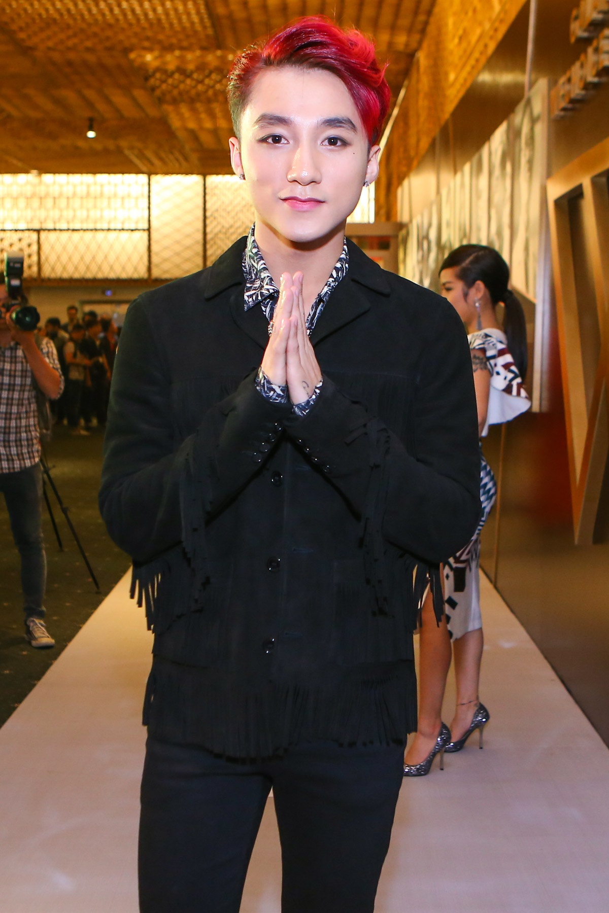 | Sơn Tùng diện "cây đen", anh tránh không chụp ảnh chung với bạn gái Thiều Bảo Trâm ở sự kiện. |