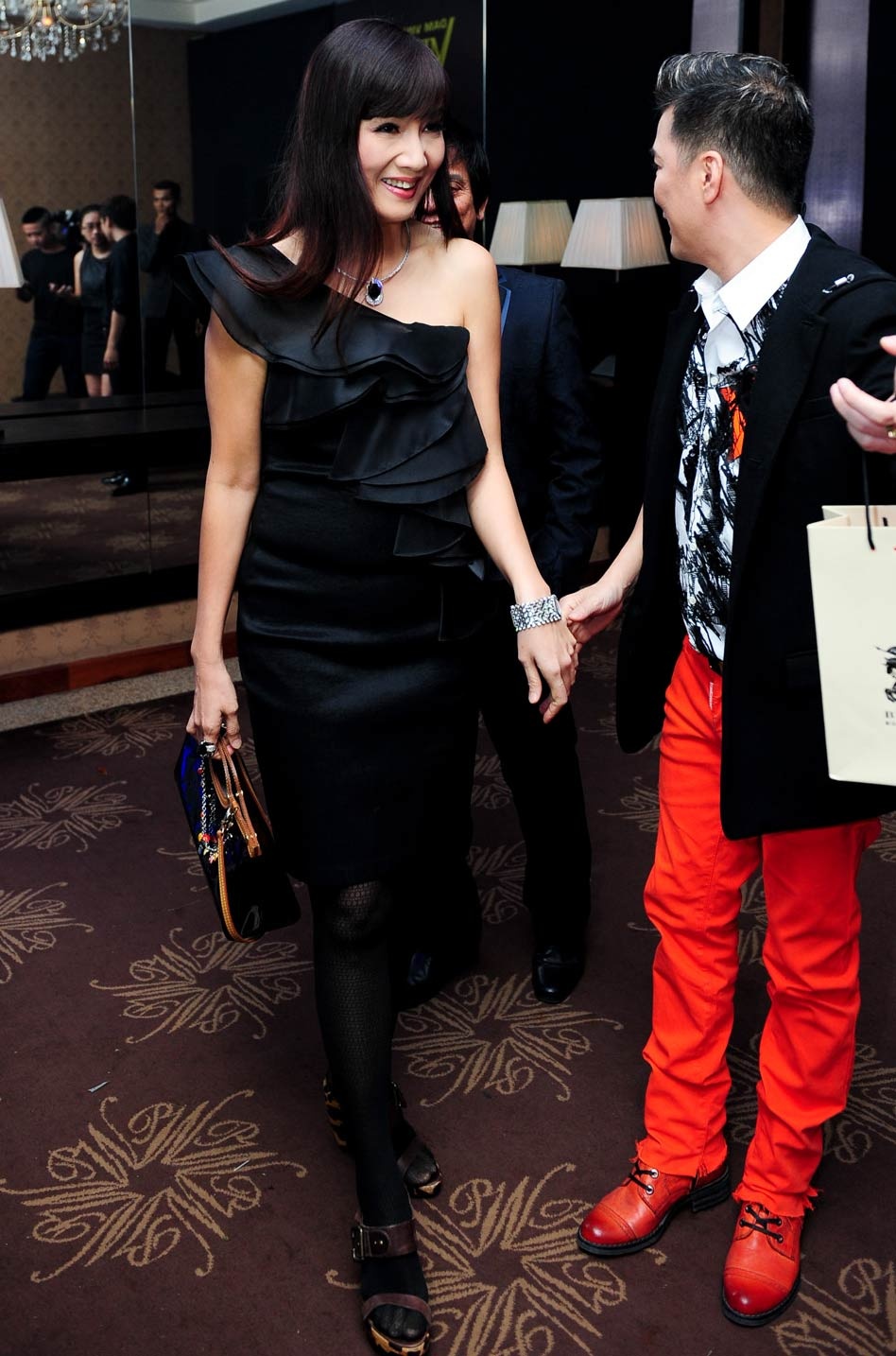 | Nữ diễn viên Hiền Mai điệu đà với chiếc đầm lệch vai. Tuy nhiên, người đẹp khá vụng về khi đi tất đen với dép sandal. Cô được nam ca sĩ đón tiếp từ ngoài sảnh. |