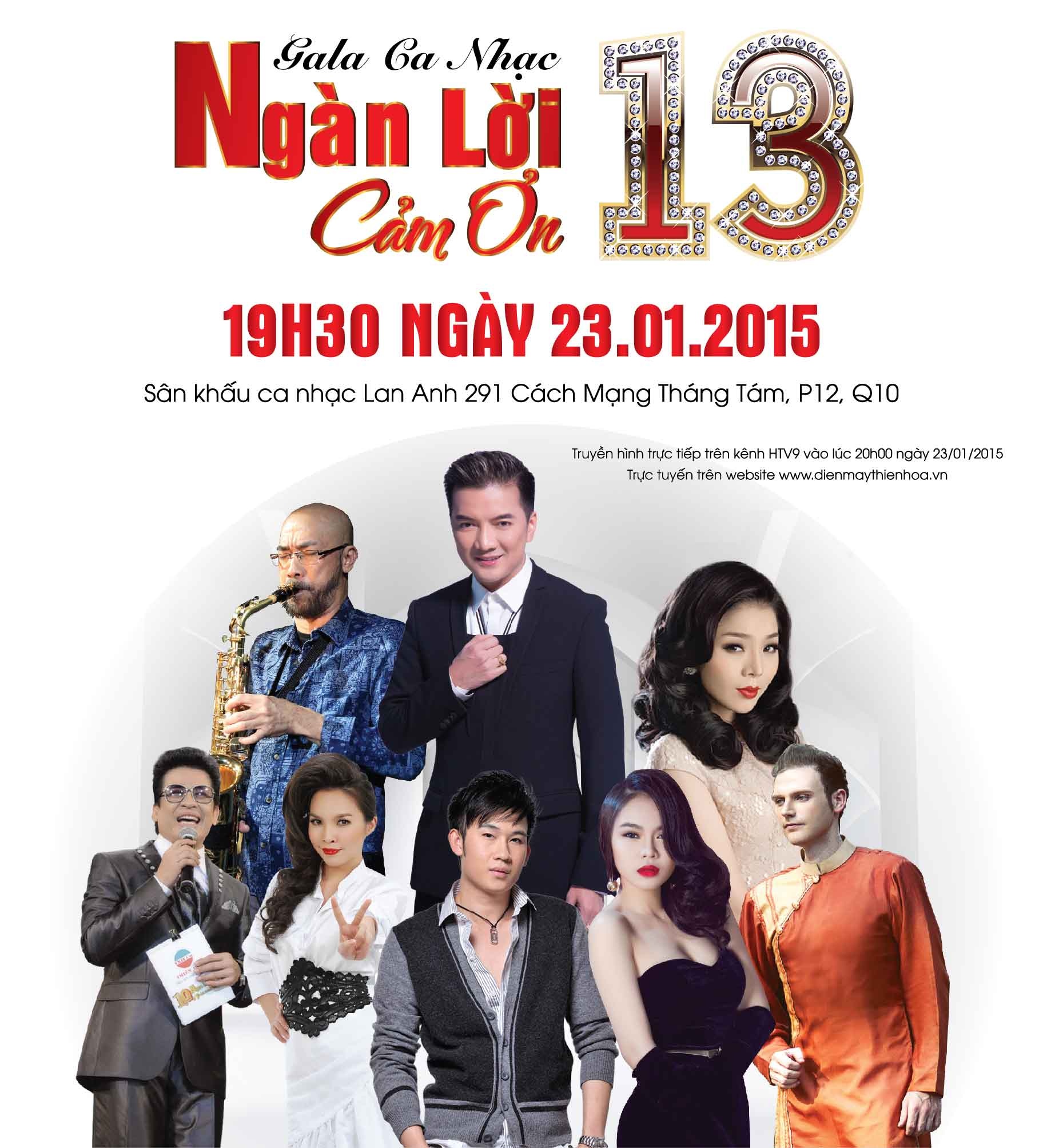 Gala ca nhạc Ngàn lời cảm ơn sẽ diễn ra lúc 20h thứ sáu ngày 23/1 tại sân khấu ca nhạc Lan Anh và được truyền hình trực tiếp trên kênh BTV1 đài truyền hình TP.HCM và website.
