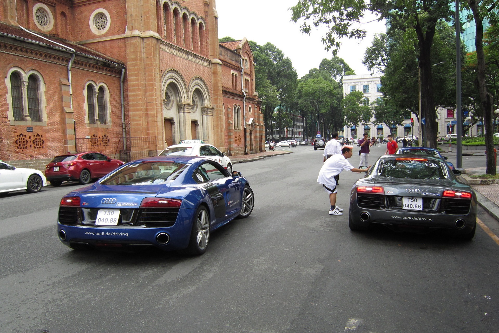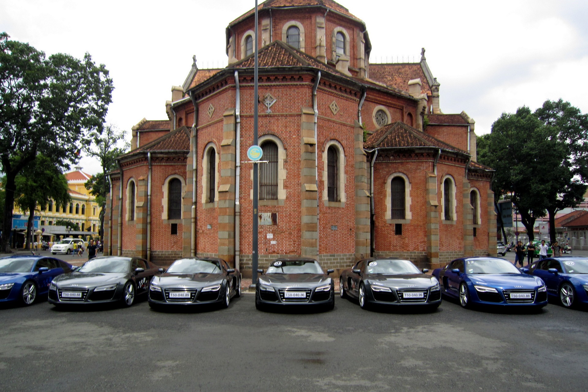 | Những chiếc R8 được xếp thành một hàng thẳng trước nhà thờ Đức Bà, quận 1, TP HCM để chụp hình. |