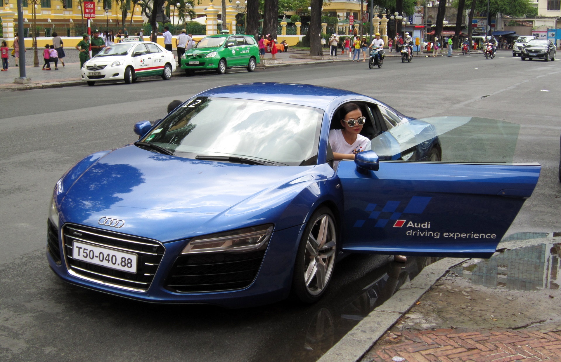 | Tham gia chương trình này có siêu mẫu Thanh Hằng. Cô trực tiếp cầm lái chiếc R8 màu xanh. |