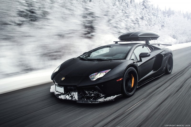 Siêu xe Lamborghini Aventador đen tuyền với hộp đựng ván trượt truyết trên nóc xe.